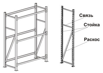 В стеллажной системе используются следующие элементы: стойки, связи, раскосы, крепежные элементы (необходимые для сборки рам), опоры и балки.